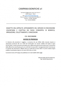 Sei in: Home1 / (URGENTE) AVVISO DI PROROGA – OGGETTO DELL’APPALTO: AFFIDAMENTO DEL SERVIZIO DI RISCOSSIONE VOLONTARIA E COATTIVA DEI RUOLI CONSORTILI DI BONIFICA, IRRIGAZIONE, COLLETTAMENTO, CONCESSIONI.2 / sub_14808373352080528127_Avviso di proroga_001